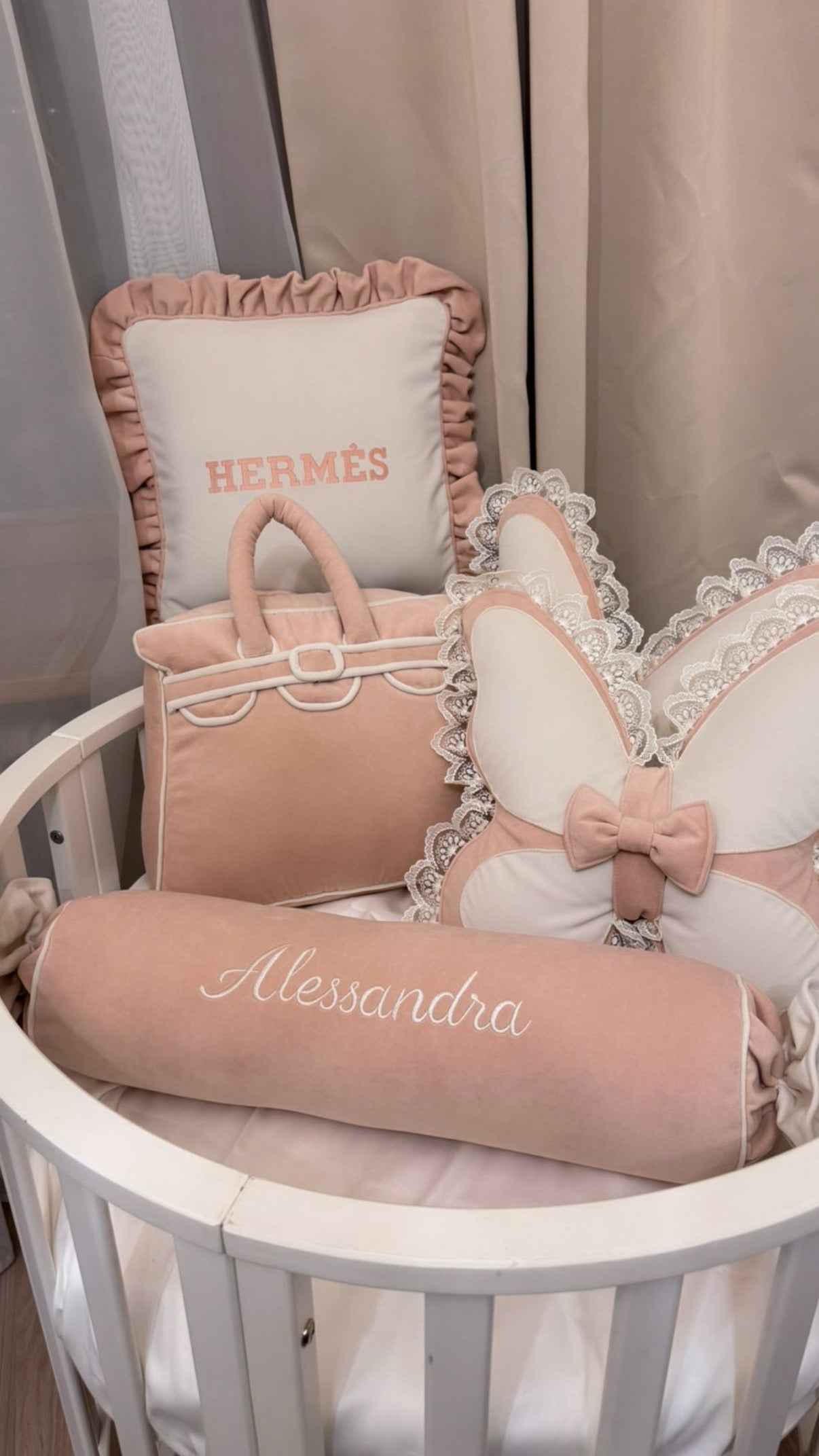 •Two butterfly cushions with velvet and hand made lace details 37cm