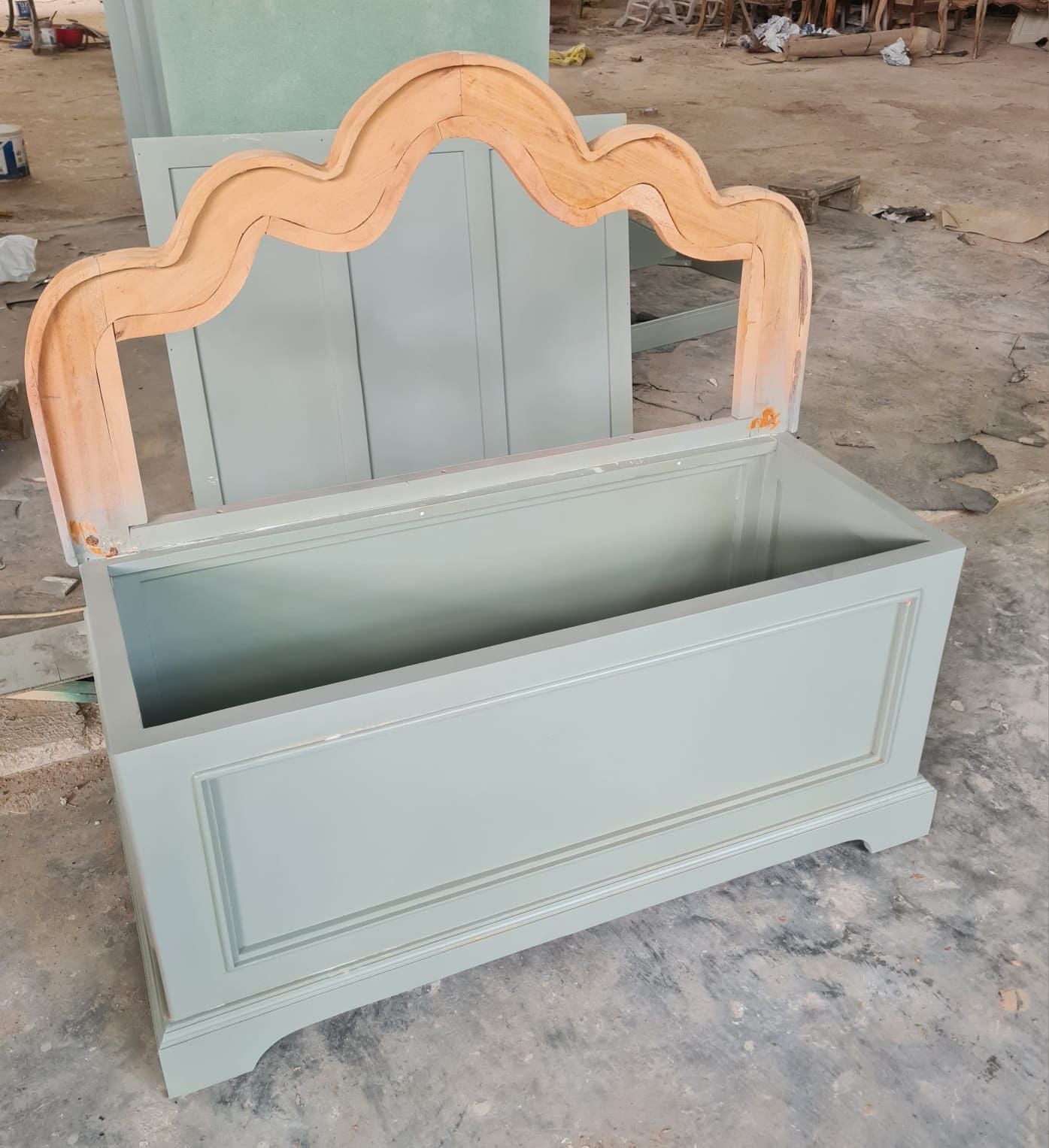 The Toy box frame itself is handmade and made in mahogany. Hand painted and hand finished the quality is exceptional.