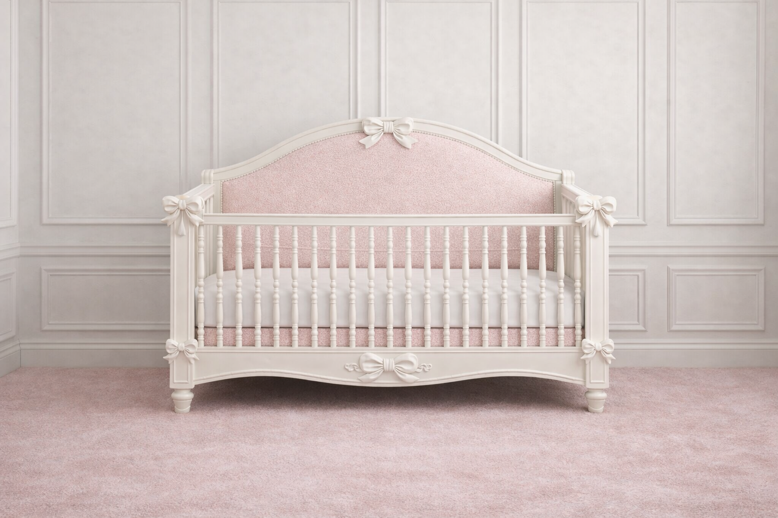 Expertly crafted with soft curved lines and finished in a smooth hand-painted cream, this dresser features a delicately upholstered back panel in a romantic blush fabric, framed by sculpted detailing and finished with signature bow accents. The silhouette is both classic and feminine, creating a seamless, cohesive look within a luxury nursery setting.