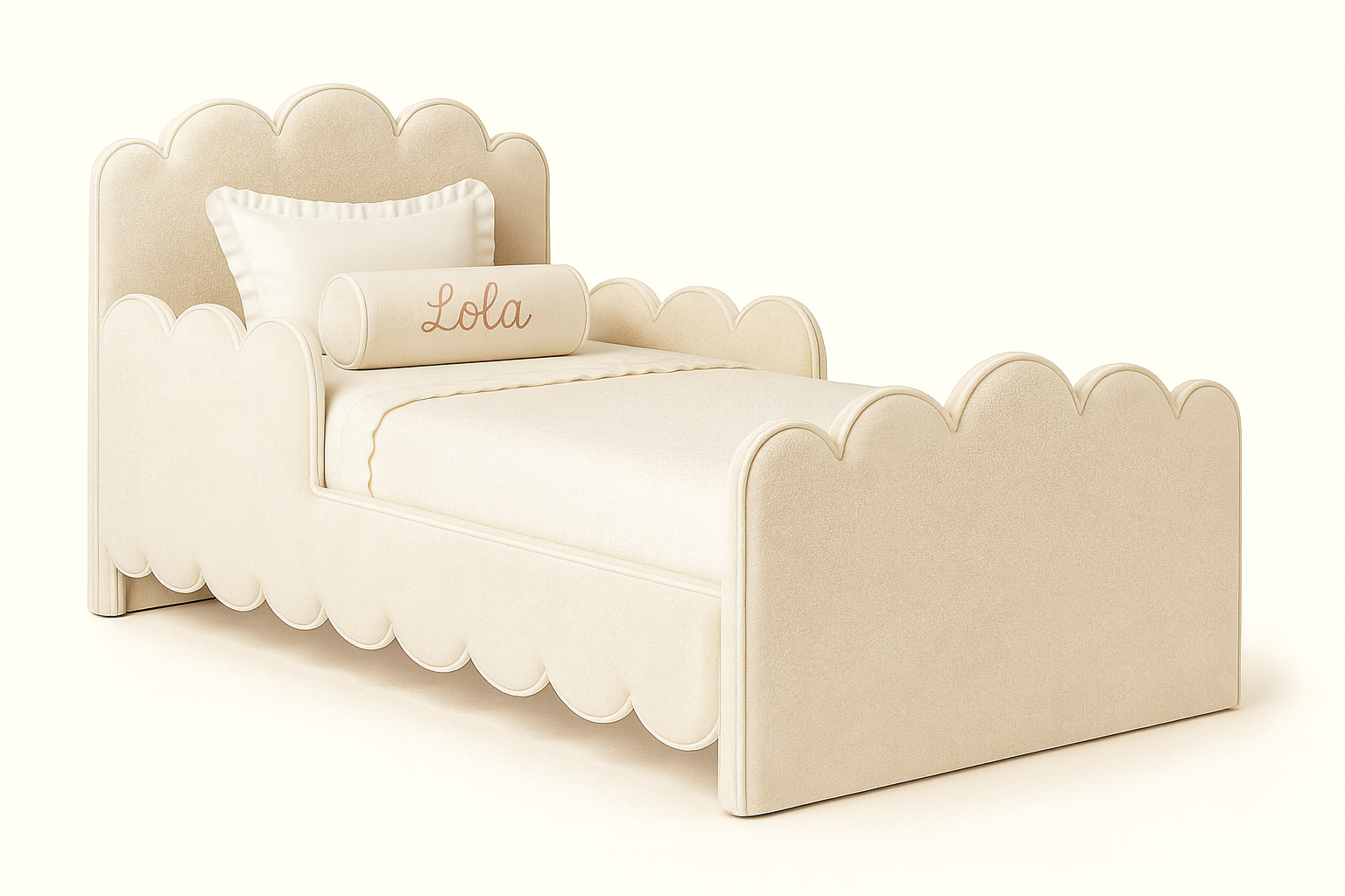 Our beautiful pretty Lola bed is here and is a one of a kind statement bed for your little one. Designed with safety sides this is perfect for your little one’s first bed. The scalloped detail has not seen before and everything is hand crafted to exceptional quality. Upholstered inside and out with a thick piping statement detail.