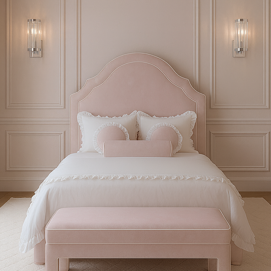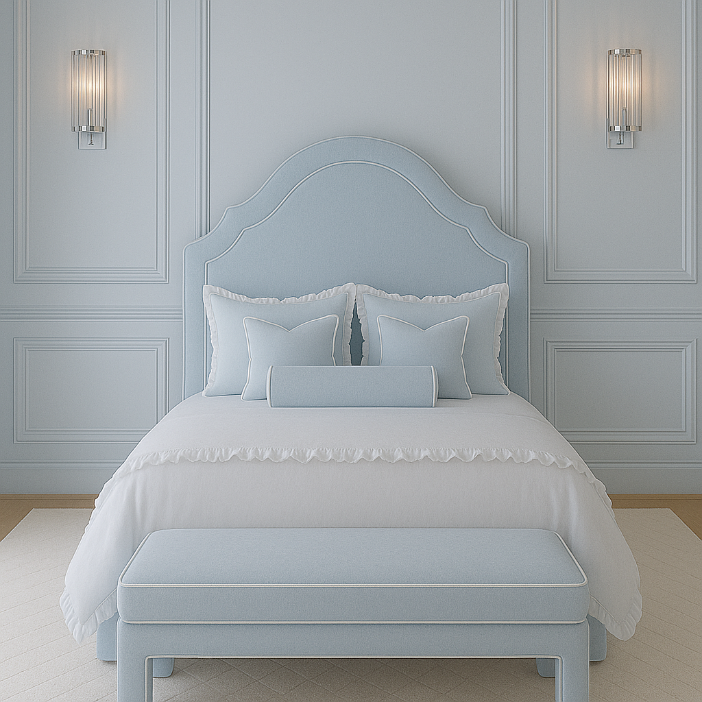 This product description highlights a stylish double-piped bench designed to perfectly complement the Seraphina bed. It is custom-made to match the bed's width and stands at a height of 42cm. Please be advised that plain fabric orders have an estimated lead time of 4-6 weeks, while printed orders may take 8-12 weeks.