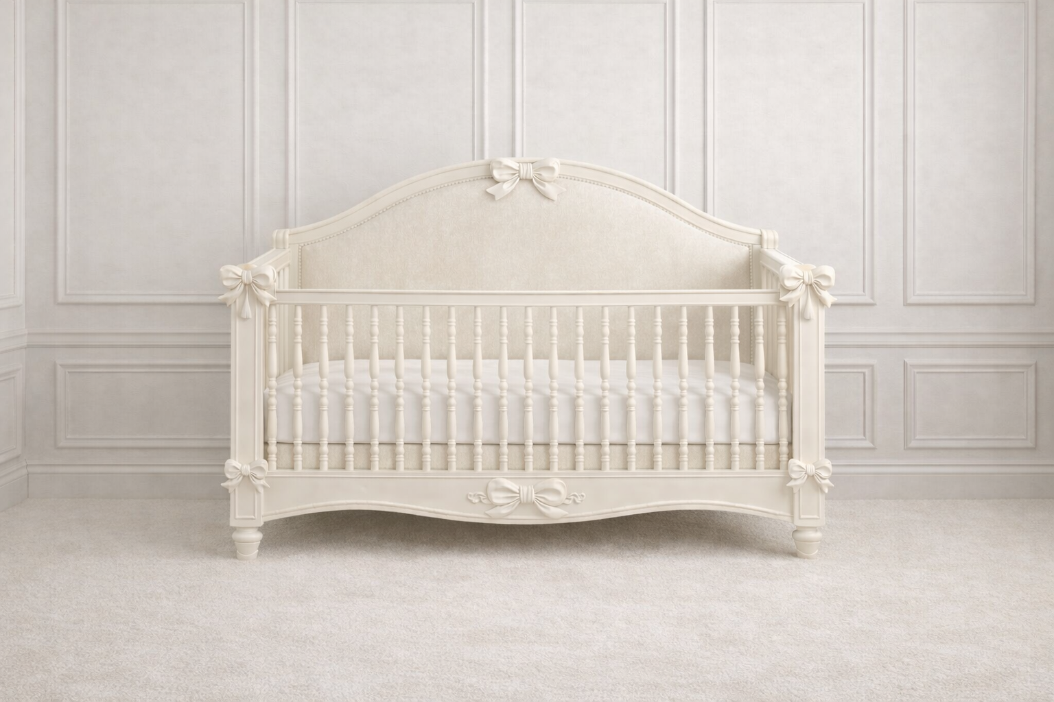 Introducing The Elizabeth Cot Bed — a timeless heirloom piece designed for the most elegant nurseries. Crafted with exquisite attention to detail, this luxury cot features a beautifully shaped silhouette, hand-finished bow detailing, and a softly upholstered back panel that adds warmth, texture, and refinement.